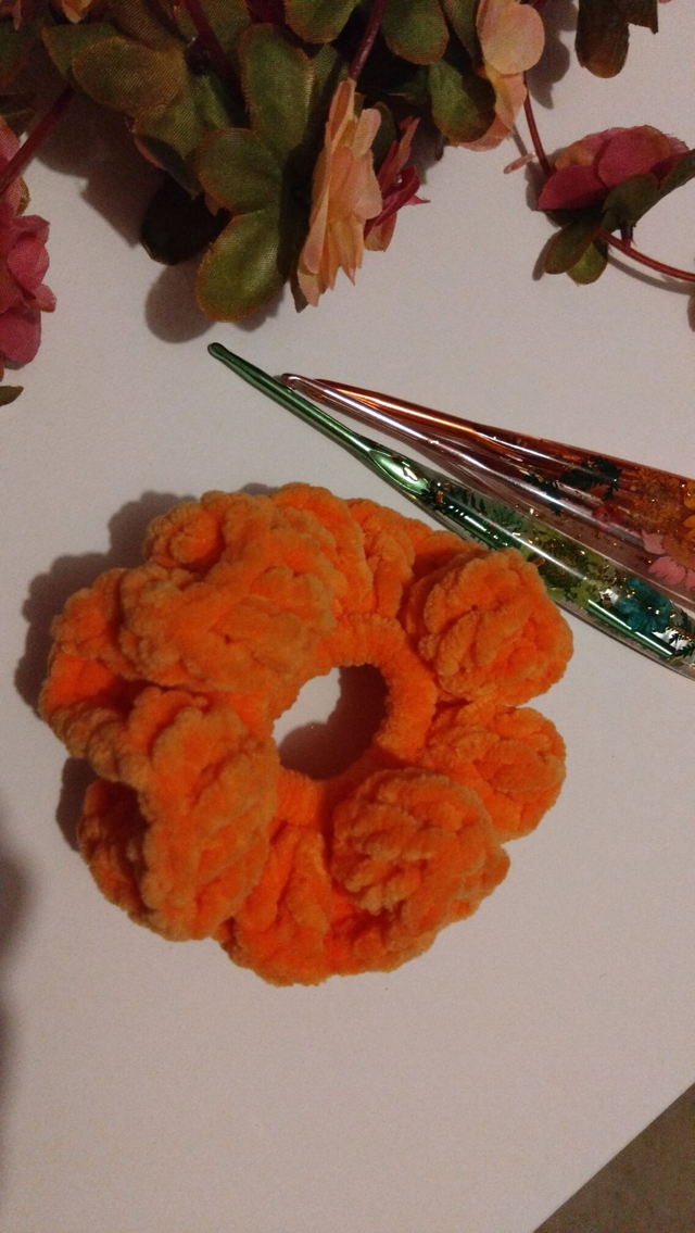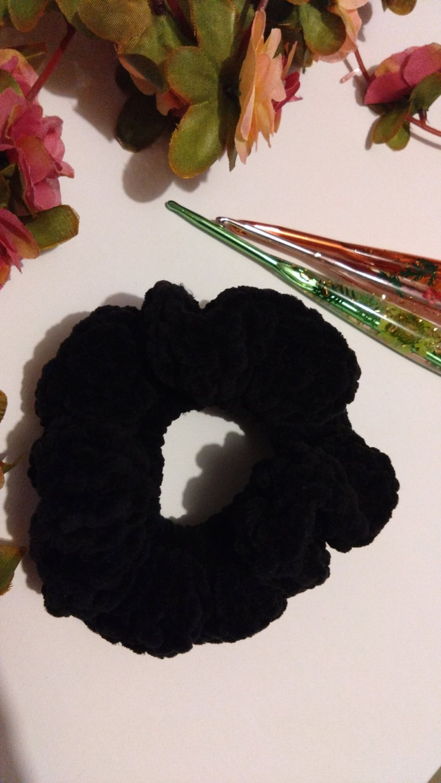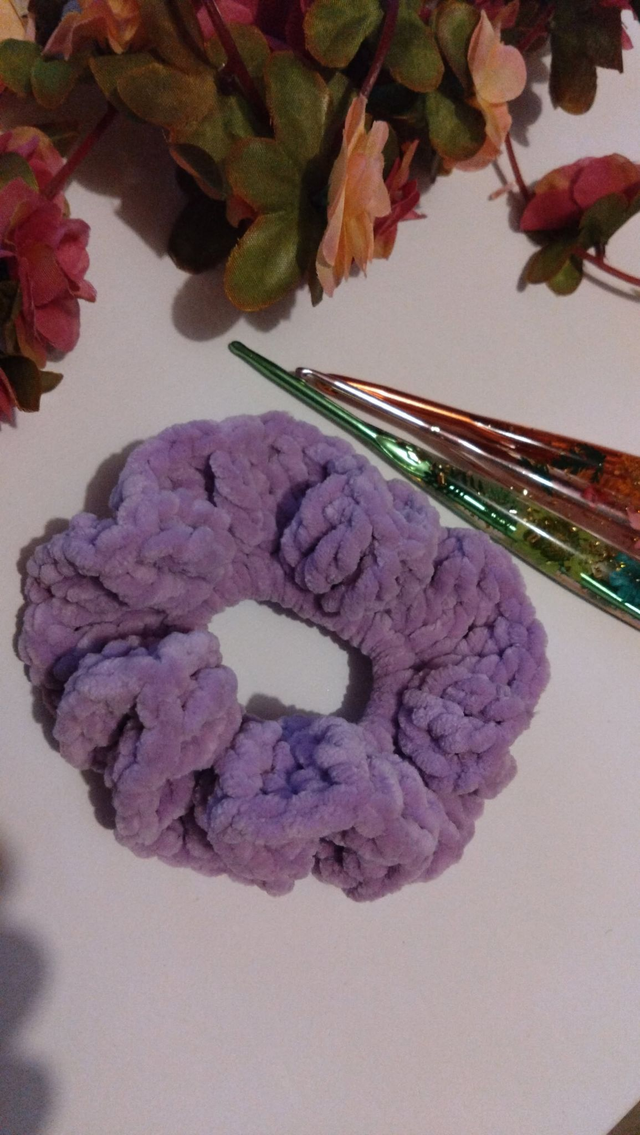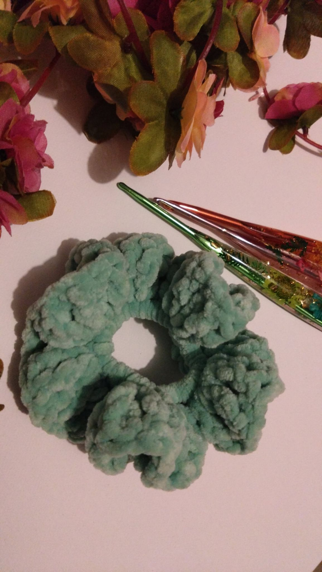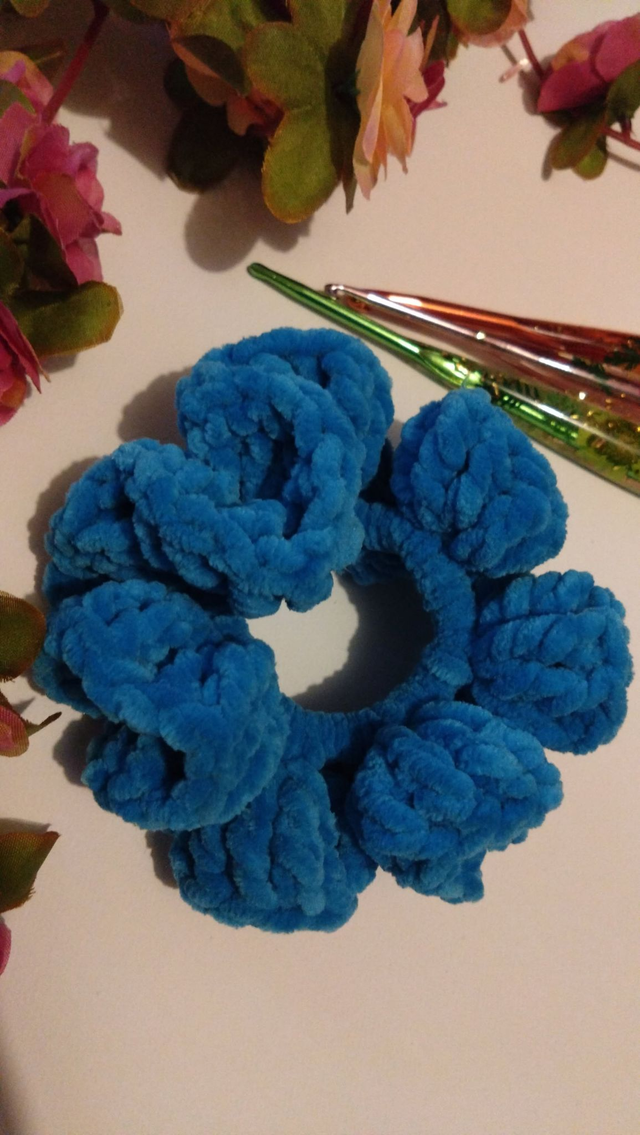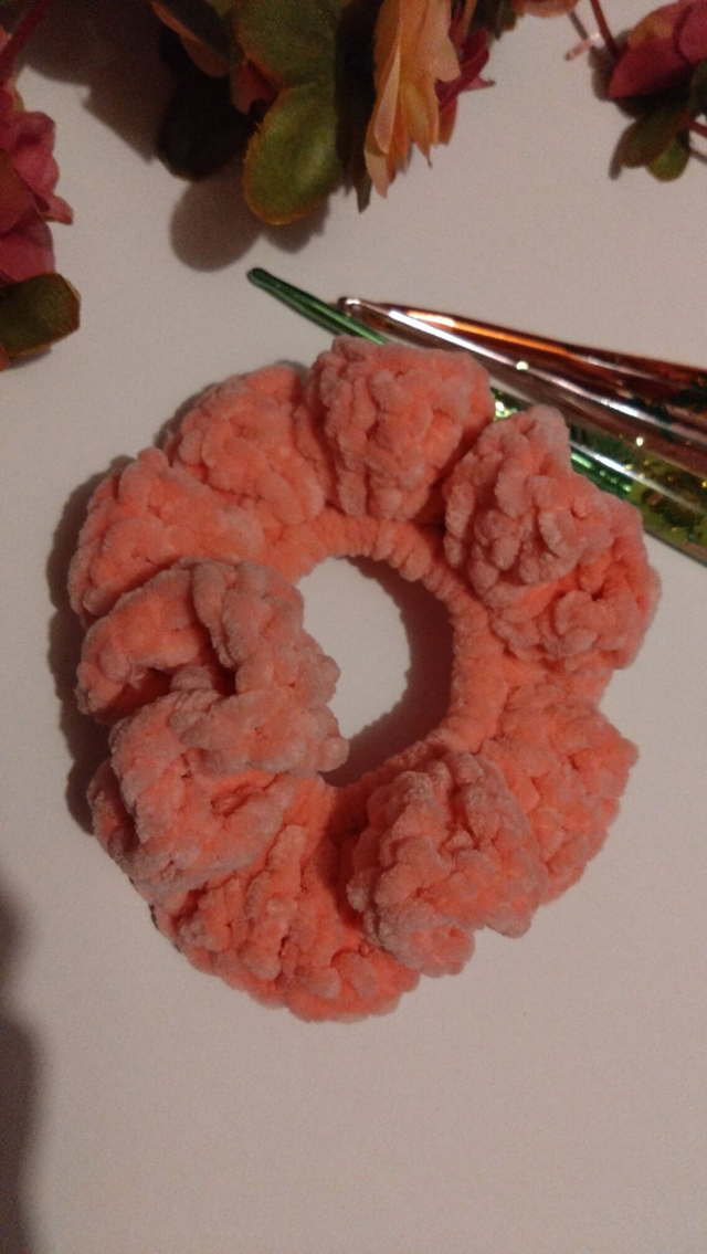 Chouchou fait main et au crochet. Fil chenille 100% polyester, longueur 13 cm