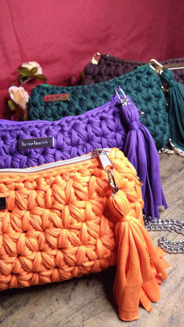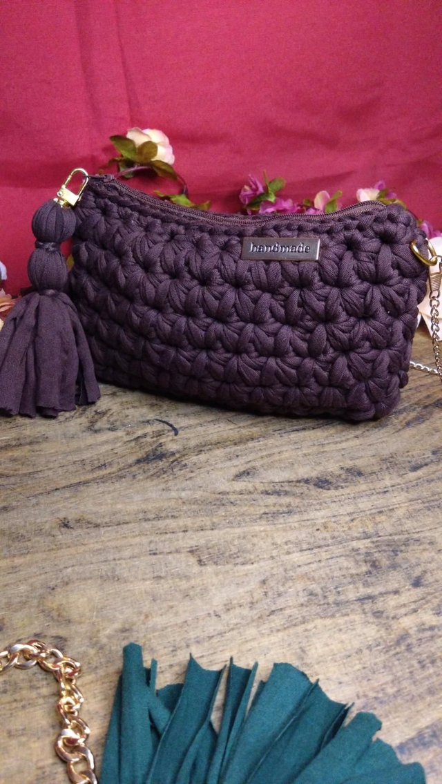 Jolie pochette pour vos soirées faite main et au crochet avec du fil trapilho 100% polyester. Largeur 23 cm, hauteur 14 cm, sangle chaînette dorée 120 cm et fermeture éclair.
