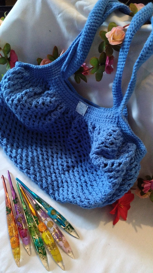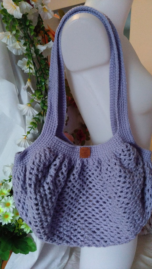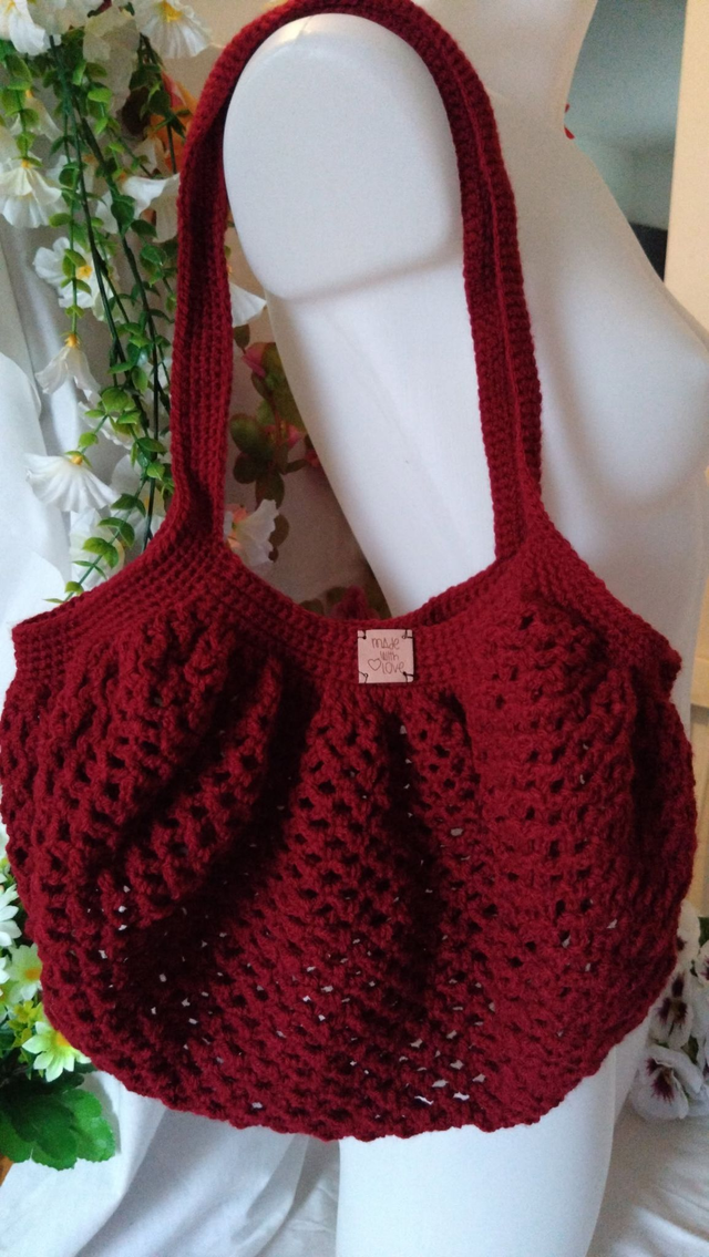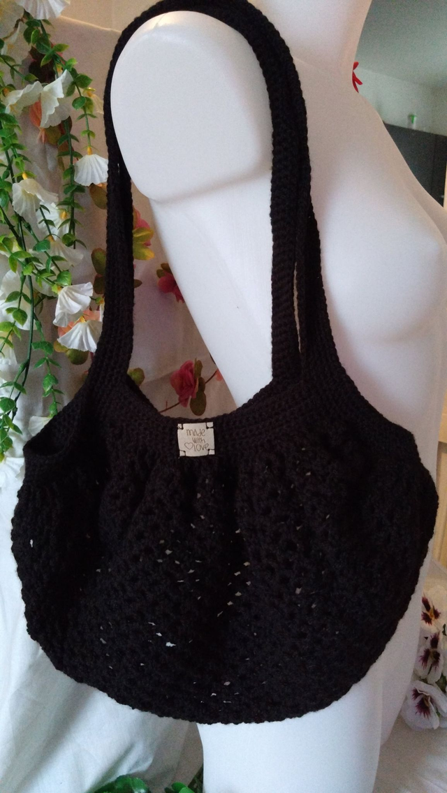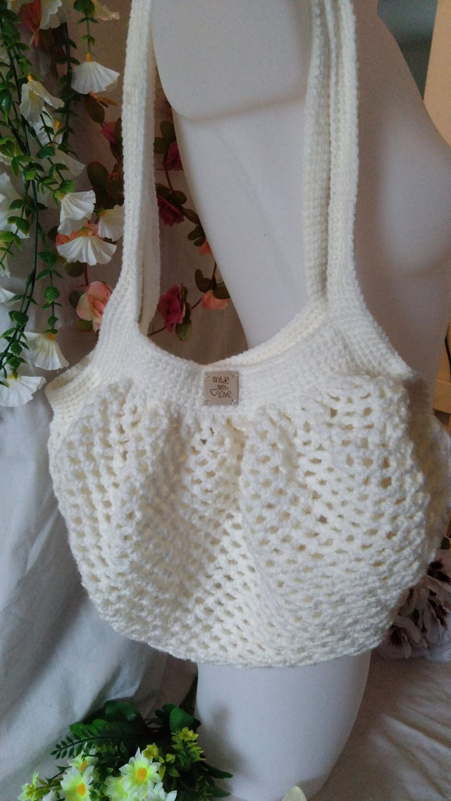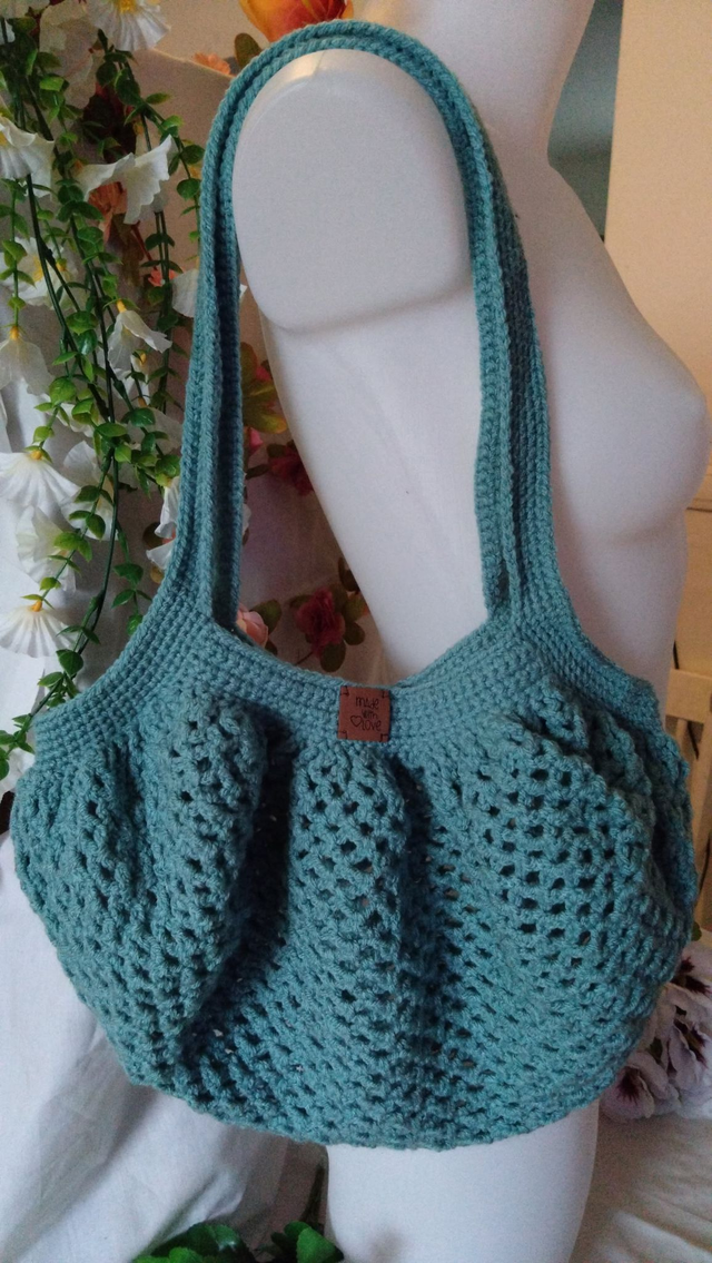 Sac filet fait main et au crochet. Fil acrylique, longueur sac 33 cm, sangles 60 cm, largeur sac 45 cm