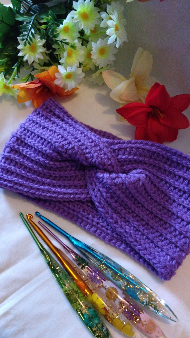 Bandeau fait main et au crochet. Fil acrylique, tour de tête 55cm (élastique), largeur 14 cm